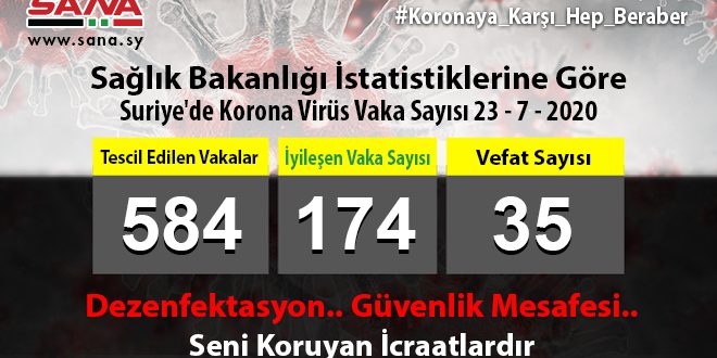 Bakanlık yayınladığı ve SANA’nın bir nüshasını aldığı beyanda, Suriye’de bugüne kadar tescil edilen koronavirüs vakaları bilançosunun 584’e yükseldiğini bunlardan 174’ünün şifa bulduğunu 35’inin de vefat ettiğini açıkladı.