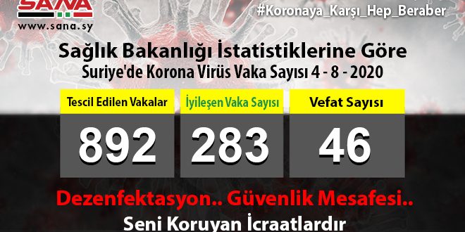 Bakanlık bugün yayınladığı ve SANA’nın bir nüshasını aldığı beyanda, Suriye’de tescil edilen koronavirüs vaka sayısının 892’ye yükseldiğini bunlardan 283’ünün şifa bulduğunu 46’sının da vefat ettiğine işaret etti.