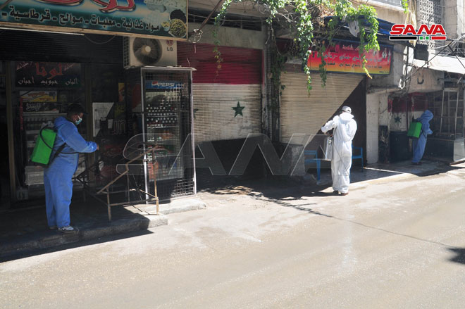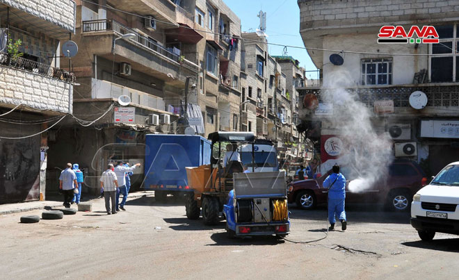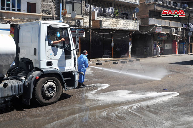 Koronavirüsün yayılmasını engelleme çabaları çerçevesinde Şam’ın farklı semtlerinde sterilize kampanyası devam ediliyor