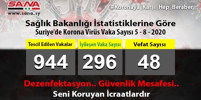Bakanlık bugün yayınladığı ve SANA’nın bir nüshasını aldığı beyanda, Suriye’de tescil edilen koronavirüs vaka sayısının 944’e yükseldiğini, bunlardan 296’sının şifa bulduğunu 48’inin de vefat ettiğine işaret etti.