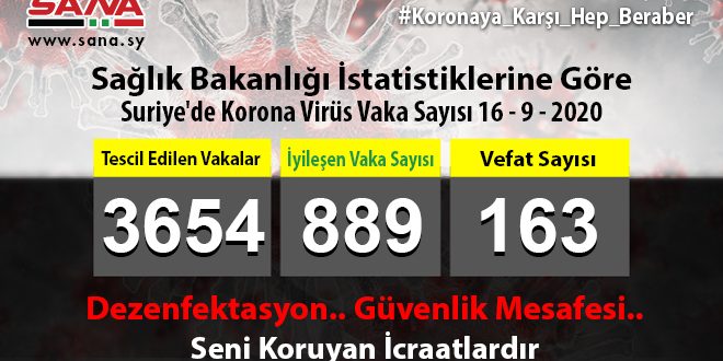 Bakanlık yayınladığı ve SANA’nın bir nüshasını aldığı beyanında, Suriye’de şu ana kadar tescil edilen koronavirüs vakaları bilançosunun, 3654’e yükseldiğini, bu vakalardan 889’unun iyileştiğini, 163’ünün de vefat etttiğini belirtti.