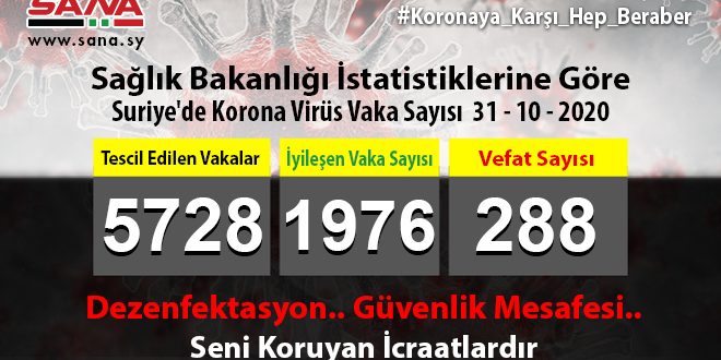 Bakanlık yayınladığı ve SANA’nın bir nüshasını aldığı beyanda, Suriye’de tescil edilen vaka sayısının bugüne kadar 5728’e yükseldiğini, bunlardan 1976’sının iyileştiğini, 288’inin de vefat ettiğine işaret etti.