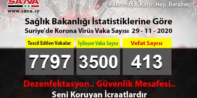 Bakanlık yayınladığı ve SANA’nın bir nüshasını aldığı beyanda, Suriye’de tescil edilen Koronavirüs vakaları bilançosunun bugüne kadar 7797’e yükseldiğini, tescil edilen koronavirüs vakalarından 3500’ünün şifa bulduğunu, 413 vakanın da vefat ettiğine işaret etti.