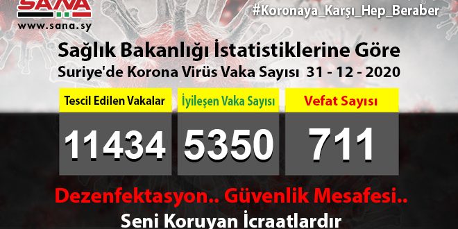Bakanlık yayınladığı ve SANA’nın bir nüshasını aldığı beyanda, Suriye’de tescil edilen vaka sayısının bugüne kadar 11434’e yükseldiğini, bunlardan 5350’sinin iyileştiğini, 711’inin de vefat ettiğine işaret etti.
