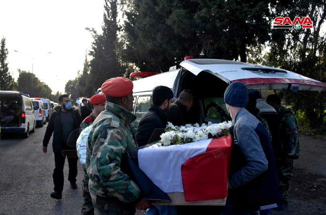 HOMS – Homs ilindeki Şehit Abdülkadir Şakfa El Askeri Hastanesi’nde gül ve defne çelengi ve şehit müziğinin ritmiyle, önceki gün Deyrezzor ile Palmyra arasındaki yol üzerindeki Kabaceb bölgesinde otobüslerini hedef alan gaddar pusuda terör elinin uzandığı şehitler kervanı sol yolculuğuna uğurlandı.