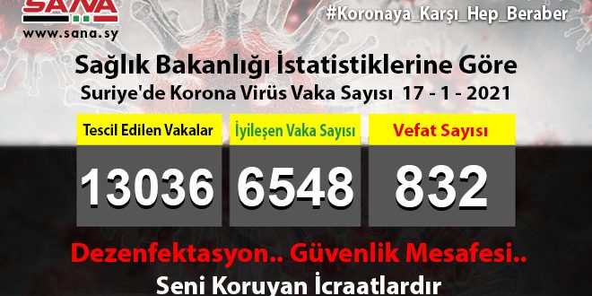Bakanlık yayınladığı beyanda, Suriye’de tescil edilen vaka ayısının bugüne kadar 13036 vakaya yükseldiğini, bunlardan 6584 vakanın şifa bulduğunu, 832 vakanın da vefat ettiğini açıkladı.