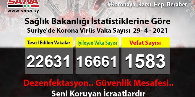 Bakanlık yayınladığı ve SANA’nın nüshasını aldığı beyanda, Suriye’de tescil edilen vaka sayısının bugüne kadar 22931’e yükseldiğini, bunlardan 16661’inin iyileştiğini, 1583’ünün de vefat ettiğine işaret etti.