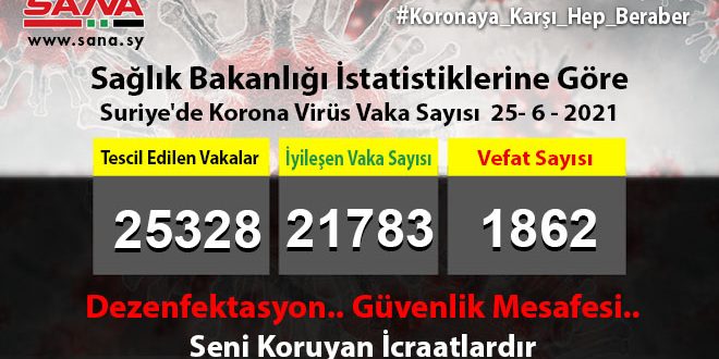 Bakanlık yayınladığı ve SANA’nın nüshasını aldığı beyanda, Suriye’de tescil edilen vaka sayısının bugüne kadar 25328’e yükseldiğini, bunlardan 21783’ünün iyileştiğini, 1862’sinin de vefat ettiğine işaret etti.