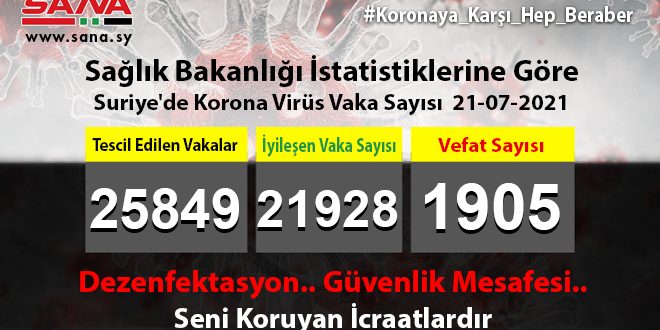 Bakanlık yayınladığı ve SANA’nın bir nüshasını aldığı beyanda, Suriye’de tescil edilen vaka sayısının şu ana kadar 25849’a yükseldiğini bunlardan 21928’inin şifa bulduğunu 1905 vakanın da vefat ettiğini açıkladı.