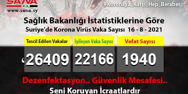 Bakanlık yayınladığı ve SANA’nın bir nüshasını aldığı beyanda, Suriye’de tescil edilen Koronavirüs vakaları bilançosunun bugüne kadar 26409’a yükseldiğini, tescil edilen korona vakalarından 22166’sının şifa bulduğunu, 1940 vakanın da vefat ettiğine işaret etti.