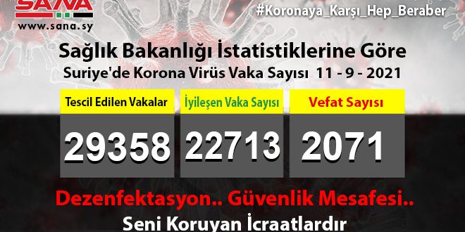 Bakanlık yayınadığı ve SANA’nın nüshasını aldığı beyanda,Suriye’de tescil edilen vaka sayısının bugüne kadar 29358’e yükseldiğini, bunlardan 22713’ünün iyileştiğini, 2071’inin de vefat ettiğine işaret etti.