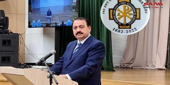 Suriye’nin Rusya Federasyonu Büyükelçisi Dr. Riyad Haddad törende yaptığı konuşmada, derneğin Suriye’ye fayda sağlamayan uluslararası terörizm karşısında Suriye halkıyla dayanışması yoluyla Suriye’de etkin ve etkili bir role katkıda bulunduğunu vurguladı.
