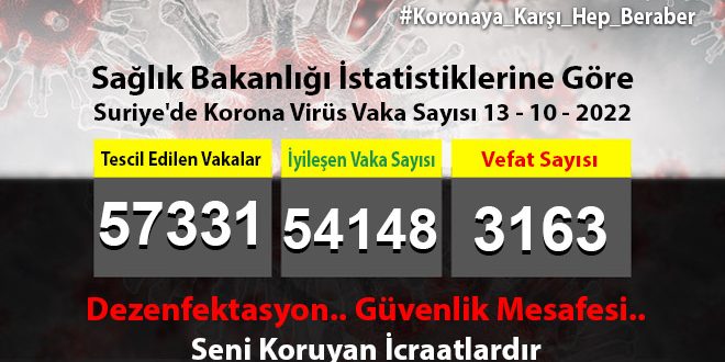 Bakanlık yayınladığı ve SANA’nın nüshasını aldığı beyanda, Suriye’de tescil edilen vaka sayısının bugüne kadar 57331’e yükseldiğine, bunlardan 54148’inin iyileştiğine, 3163’ünün de vefat ettiğine işaret etti.