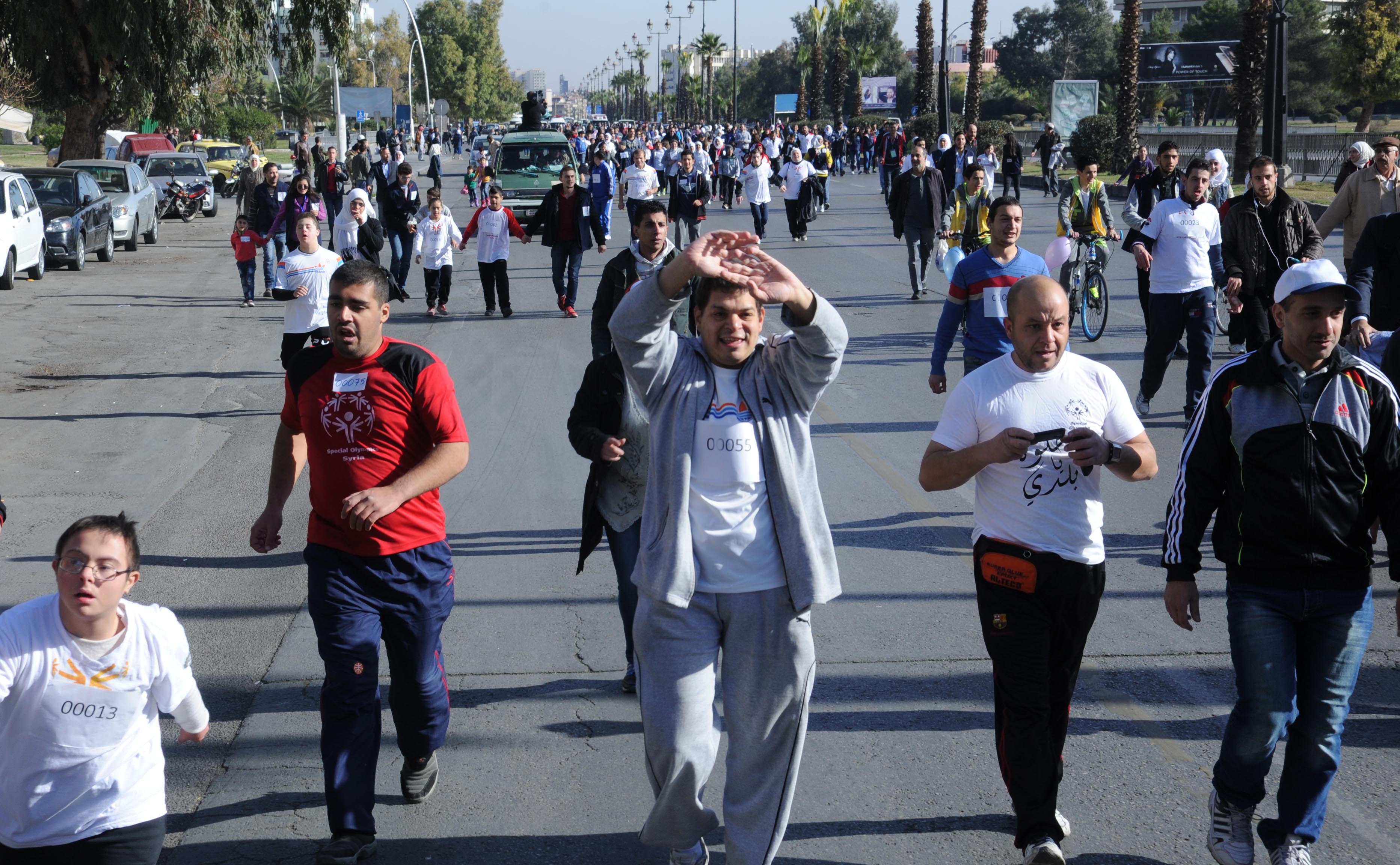 Şam’ın Mezze Otobanında ‘Hep Birlikte Her Şeyin Üstesinden Geliriz’ sloganı altında bir kilometre mesafede düzenlenen yarışmanın bitiminde engelliler futbol takımı karnaval sunum maçı oynadı.