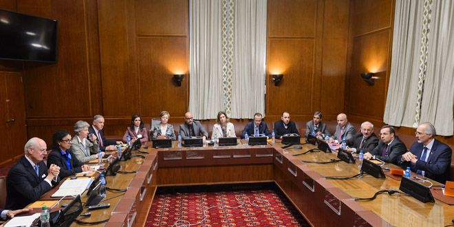 CENEVRE – Cenevre III görüşmelerinde Suriye’nin BM’deki daimi temsilcisi Beşşar el Caferi başkanlığındaki Suriye Arap Cumhuriyeti hükümet heyeti Cenevre’ye ulaşması ardından BM Suriye özel temsilcisi Staffan de Mistura ile bir araya geldi.