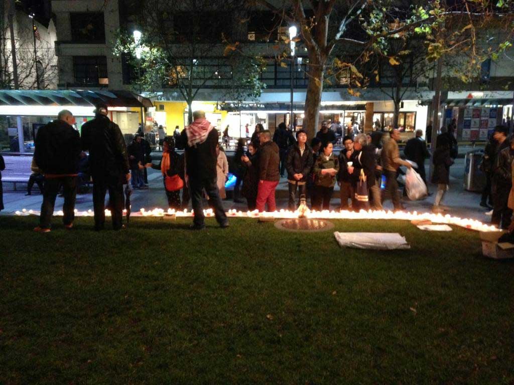 Suriye, Lübnan ve Irak’ta terör gruplarının kınanmasını ve bu teröre desteğin kesilmesini talep eden pankartlar taşıyan eylemciler; şehitler adına bir dakikalık saygı duruşunda bulunup ruhlarının şad olması için mumlar yaktılar.